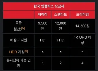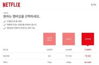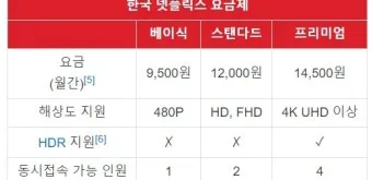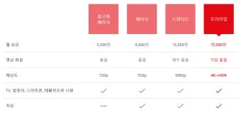 프리미엄 | 17,000 | 4K(돌비비전 지원 기기에서)·HDR | 4 | 가능 | 추가회원 최대 2명(각 월 5,000원) |
