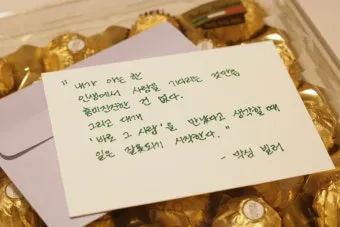“당신의 서랍에 작은 메모를 넣어둘게요. 힘든 날엔 그 메모를 한 번만 펼쳐봐요. ‘당신은 생각보다 강하고, 나는 당신을 생각보다 더 사랑해요.’ 그 말이 당신을 되돌려놓길 바라요.”